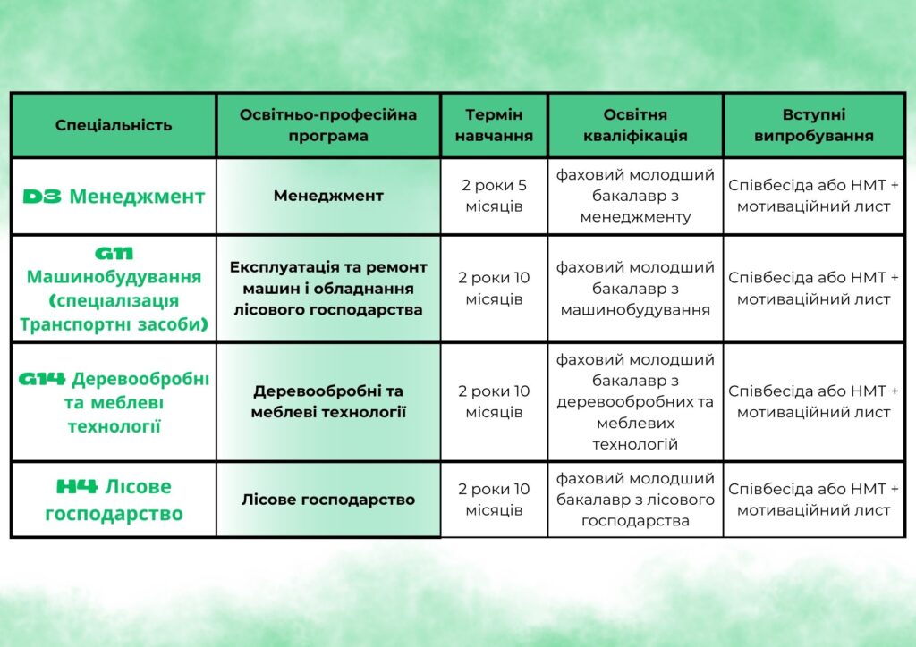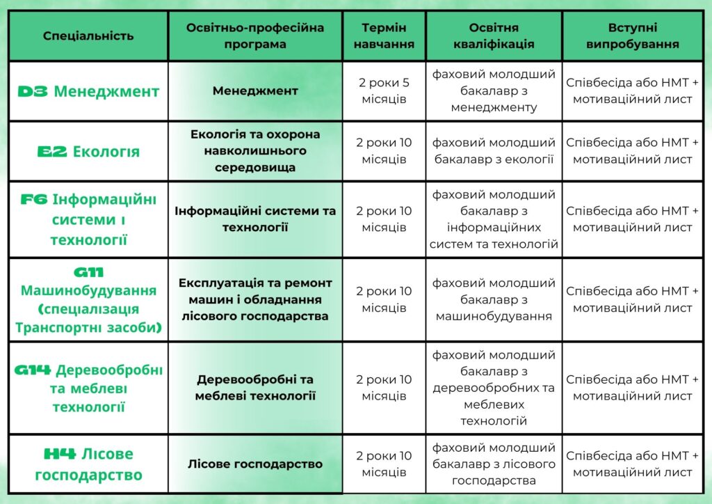 Закарпатський лісотехнічний фаховий коледж здійснює набір вступників на основі повної загальної середньої освіти (11 клас) для здобуття освітньо-професійного ступеня фаховий молодший бакалавр.